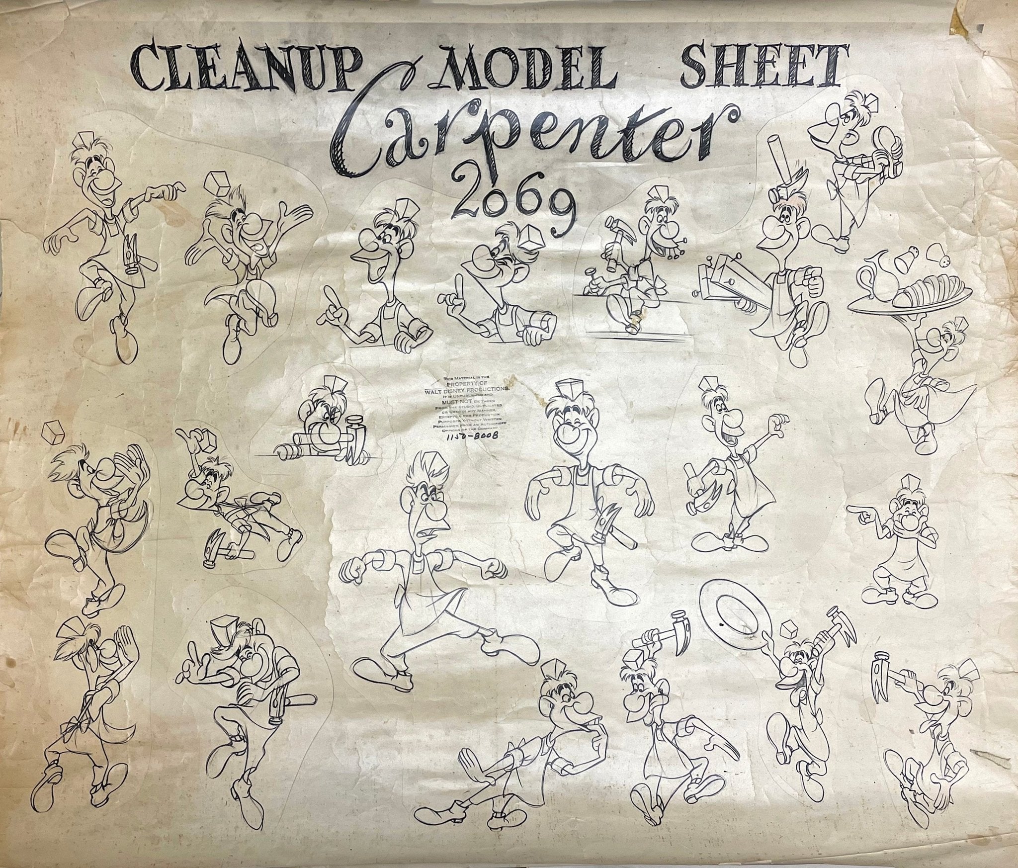 ABOUT THE MEDIUM: Photostat Model Sheets are reference guides used by animators to ensure consistency in character design, proportions, and expressions throughout a film. These printed sheets typically feature multiple poses, facial expressions, and turnarounds of a character, often photocopied from finalized drawings by lead animators. Model sheets help maintain uniformity in animation by providing a standard reference for all artists working on a character, preventing visual discrepancies between different scenes.