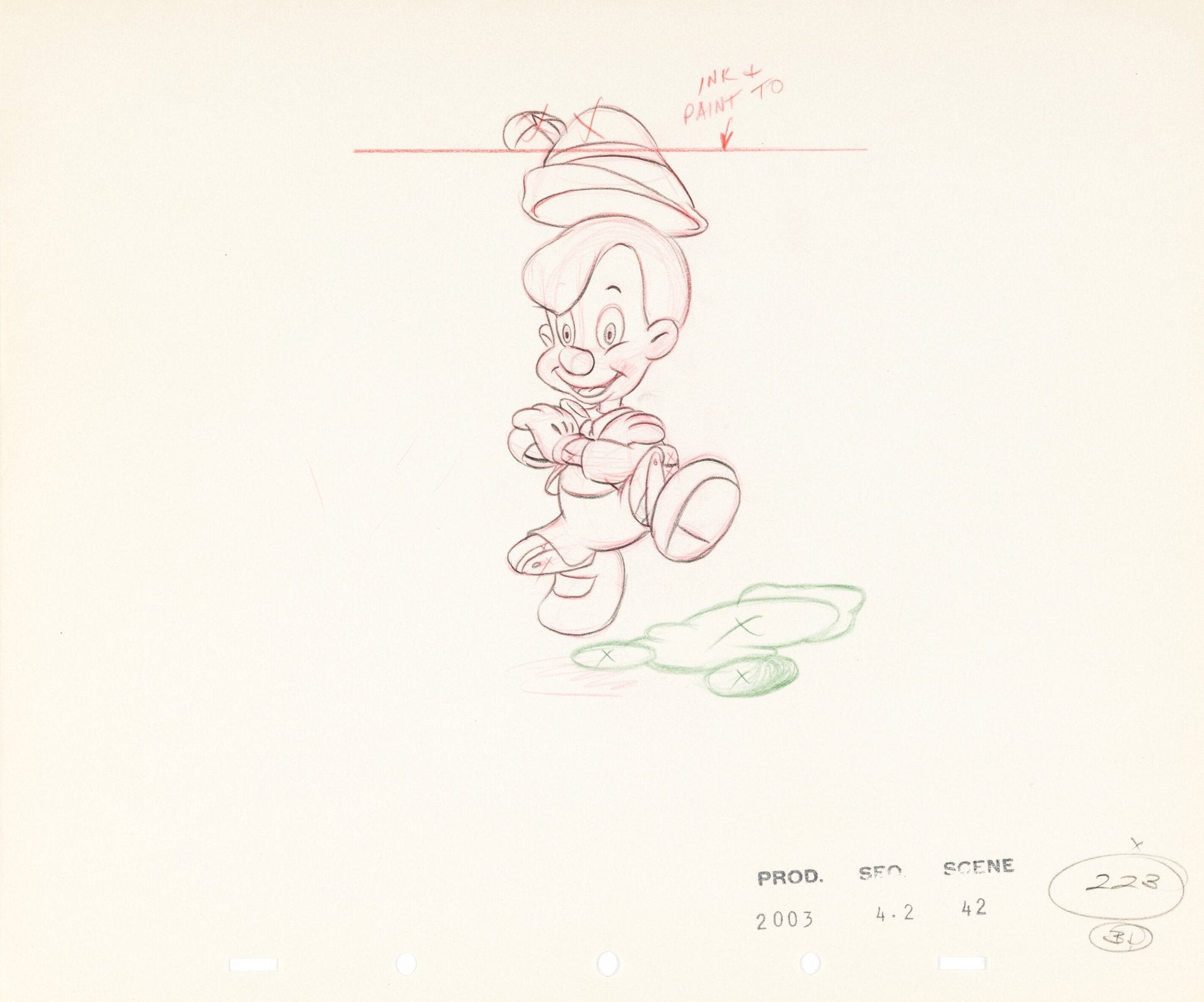 ABOUT THE IMAGE: "I had strings, but now I'm free! There are no strings on me!" Pinocchio participates in a traditional dance during the Russian segment of the entertaining "I Got No Strings" musical number from Walt Disney's beloved classic Pinocchio. This is a rare original animation drawing featuring the character in Stromboli's puppet show, rendered expertly in graphite and color pencil on a sheet of 12 field 5-peghole animation paper. It is exceptionally rare to find a drawing from this scene, and it bears official studio stamps with the production, sequence, and scene numbers 2003, 4.2, and 42.