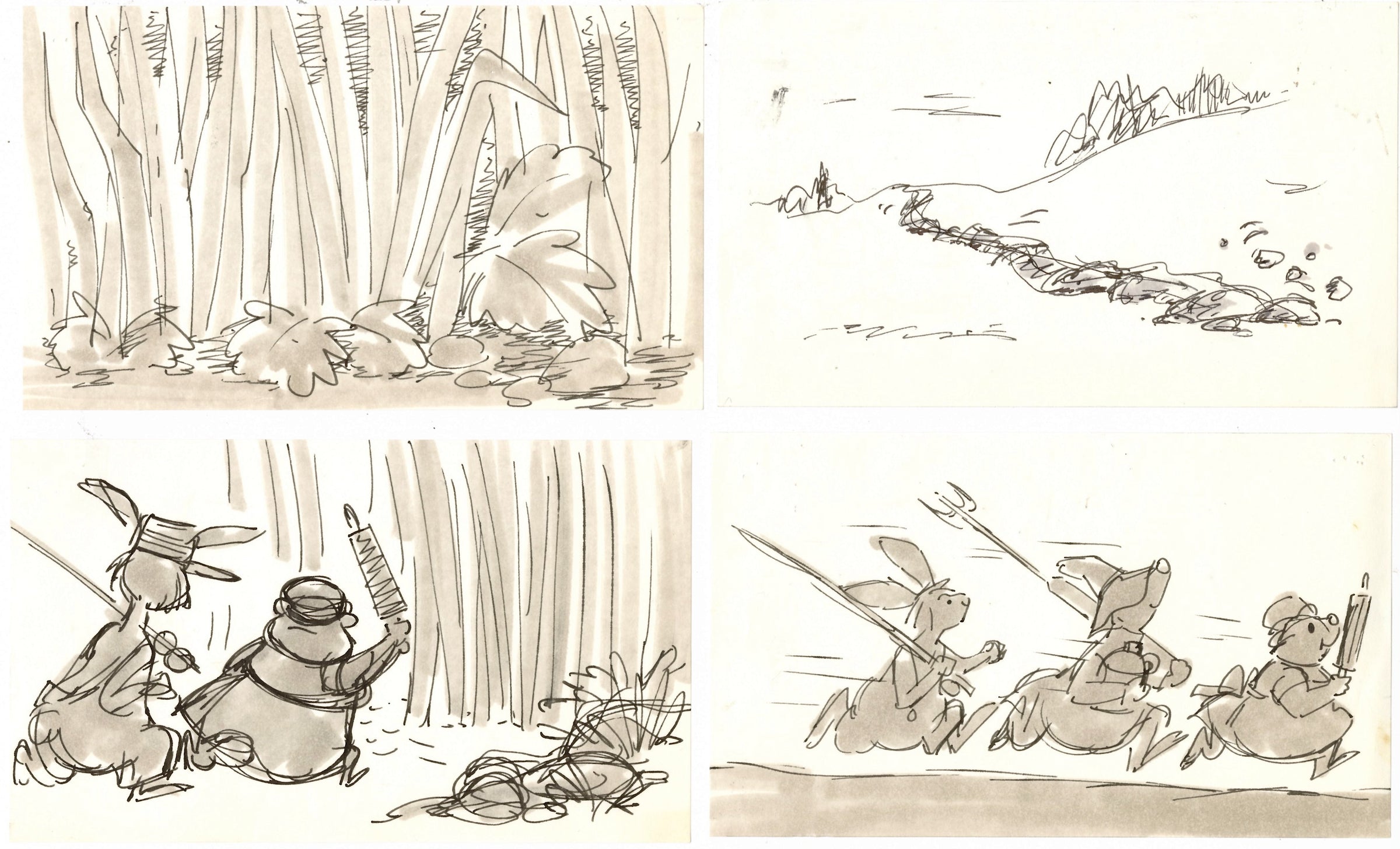 The storyboards were all created by the exceptional writer and story artist Ted Berman (1919 - 2001), who contributed to a variety of Disney films, shorts, and featurettes including The Black Cauldron and The Fox and the Hound. The storyboards and prints were largely created for: the sequence at the beginning of the film with the Rescue Aid Society where Bernard and Bianca are introduced, starting at roughly 6:22; the chase sequence where Madame Medusa, Mr. Snoops, and Medusa's crocodiles hunt Bernard and Bianca, starting at around 46:49; and the fight sequence at about 1:09:31 when Ellie Mae and crew help Bernard and Bianca fight off Madame Medusa.