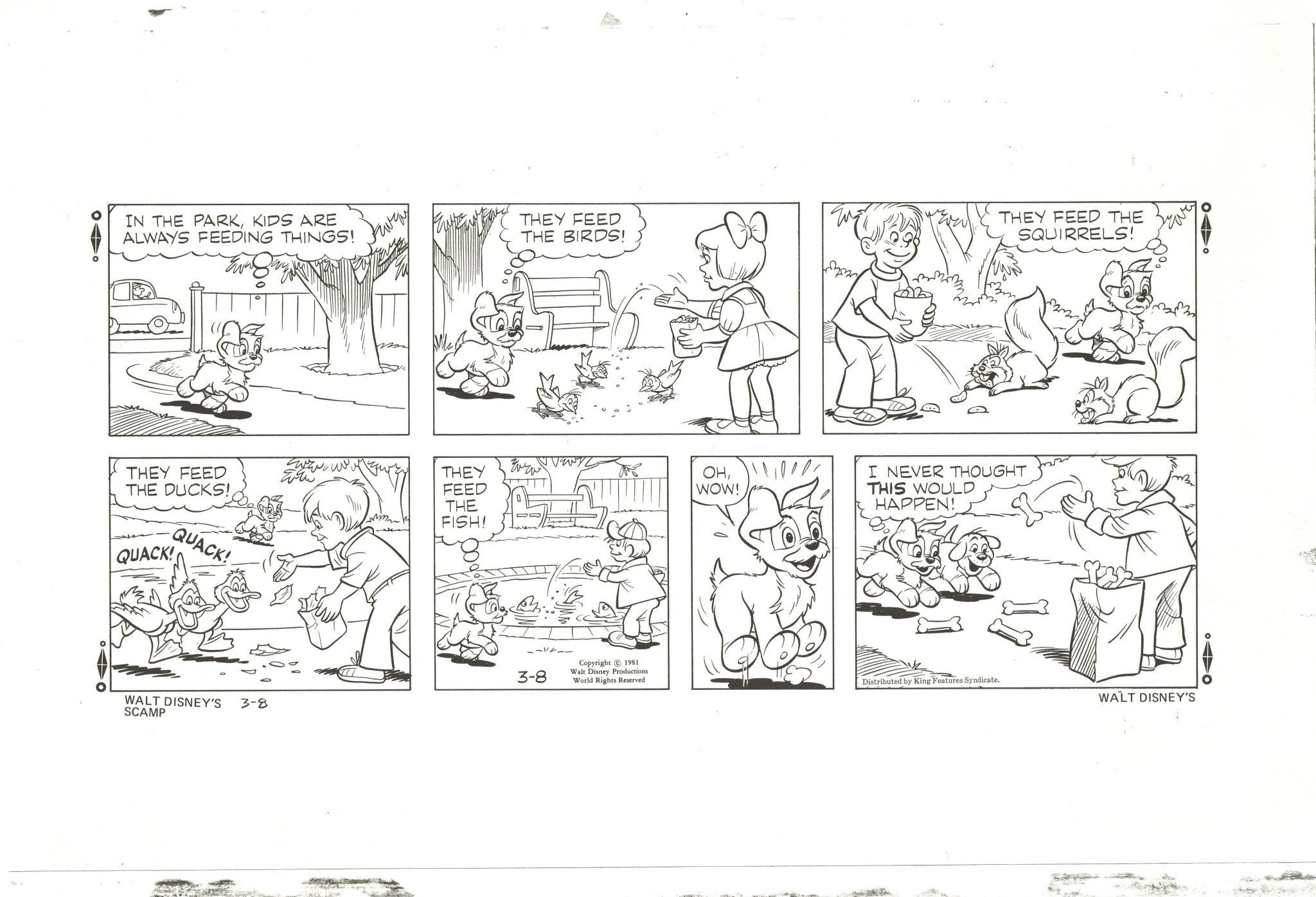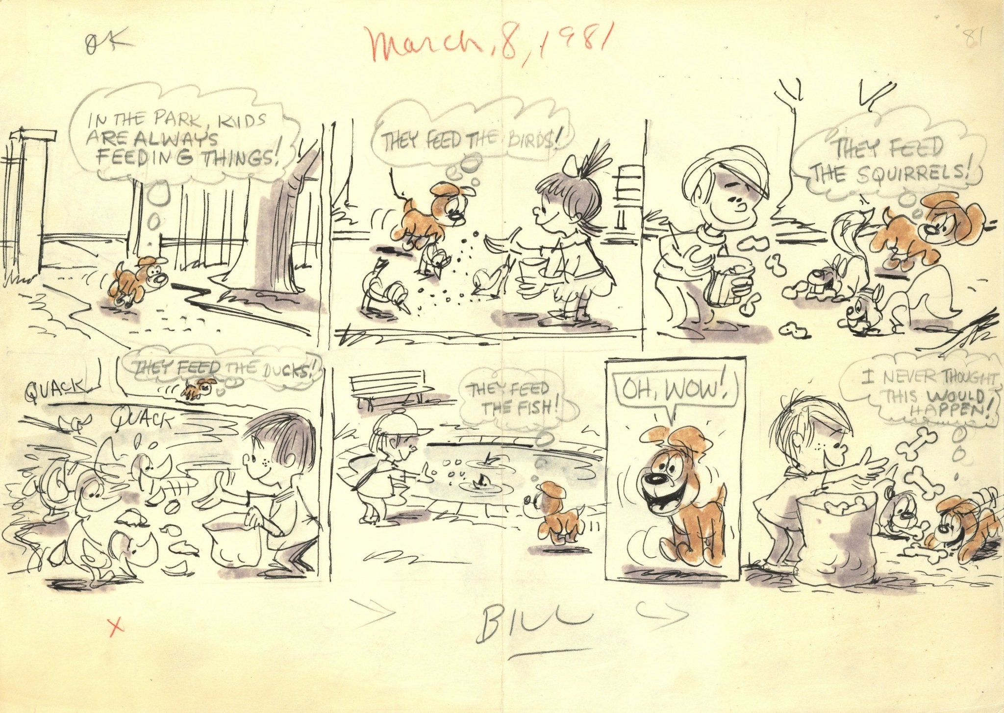 ABOUT THE IMAGE: This is artist-writer Bill Berg's lively original drawing for the Sunday comics episode published March 8th, 1981 with a copy of the black and white printed proof of the final version issued by King Features Syndicate to subscribing newspapers. "Oh, Wow!" Scamp's day has arrived! Editor's "OK" and publication date are written in black and red pencil in the top margin of the drawing.