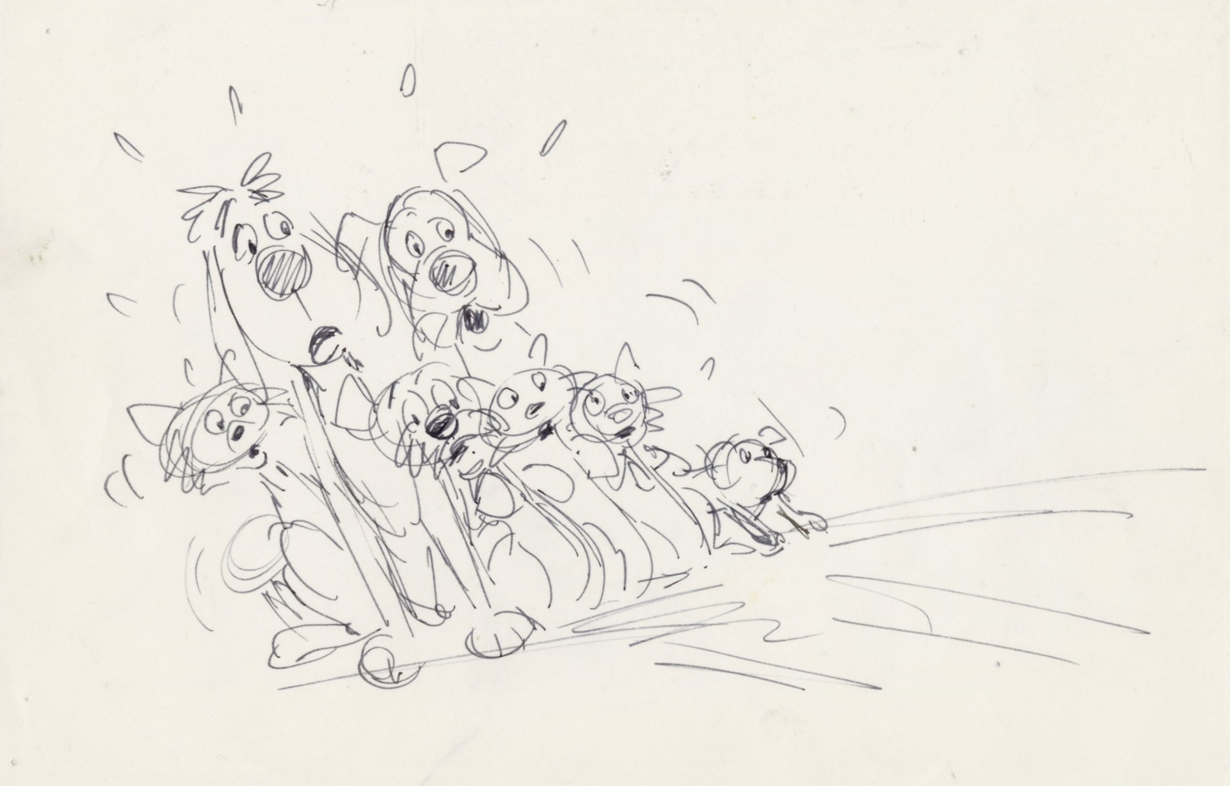 ABOUT THE IMAGE: This storyboard from Oliver & Company was originally drawn by Ted Berman (1911 - 2001), longtime story artist and writer and co-director of The Fox and the Hound and The Black Cauldron. The film put a spin on the classic tale of Oliver Twist and was something new for Disney, a trial run for including extensive computer animation in their features and returning to a musical format for their animated films.