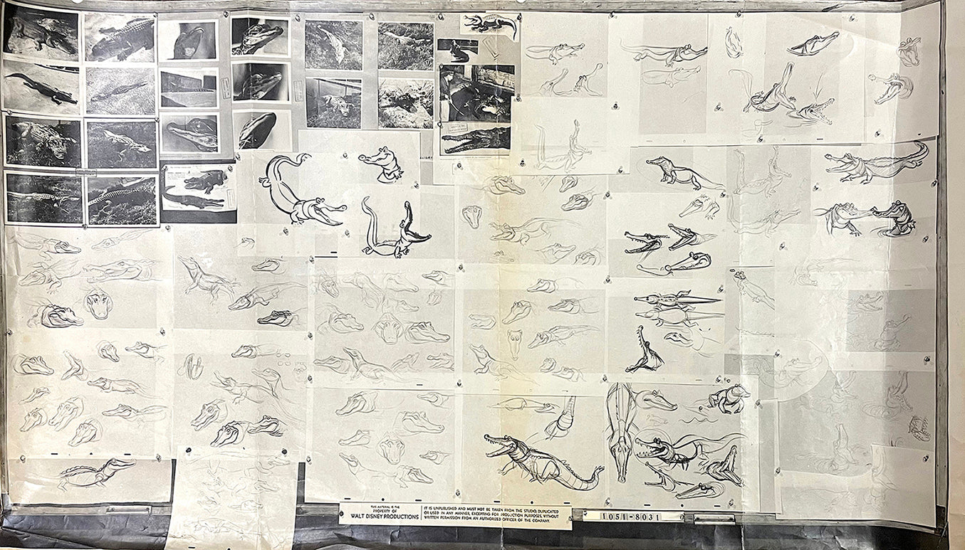 ABOUT THE IMAGE: When animating animals, Disney artists frequently studied live or photo reference to gain inspiration and accuracy. This photostat print displays a massive board of concept sketches and reference images for Tick-Tock, the crocodile from the 1953 film Peter Pan.