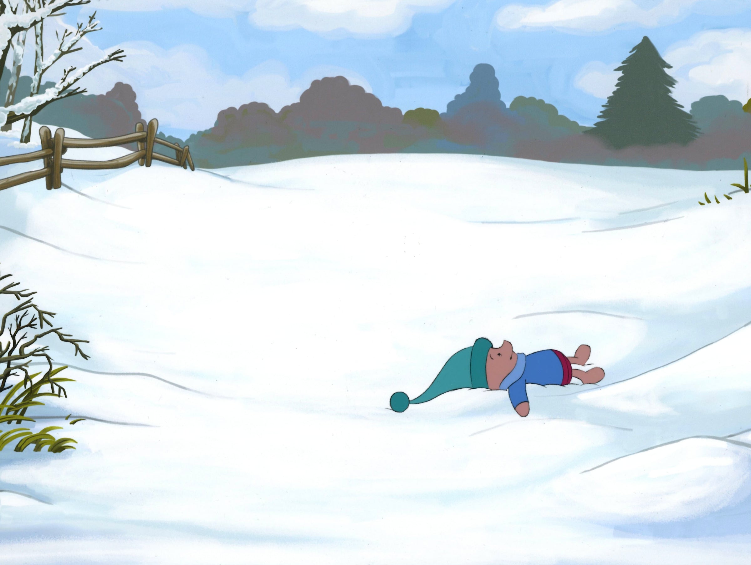 ABOUT THE MEDIUM: Original production cels are one-of-a-kind pieces of art that were used in the creation of an animated film or television show. Each has been hand-painted by studio artists on a piece of celluloid acetate, and has been photographed over a background painting to create a frame of the finished production.
