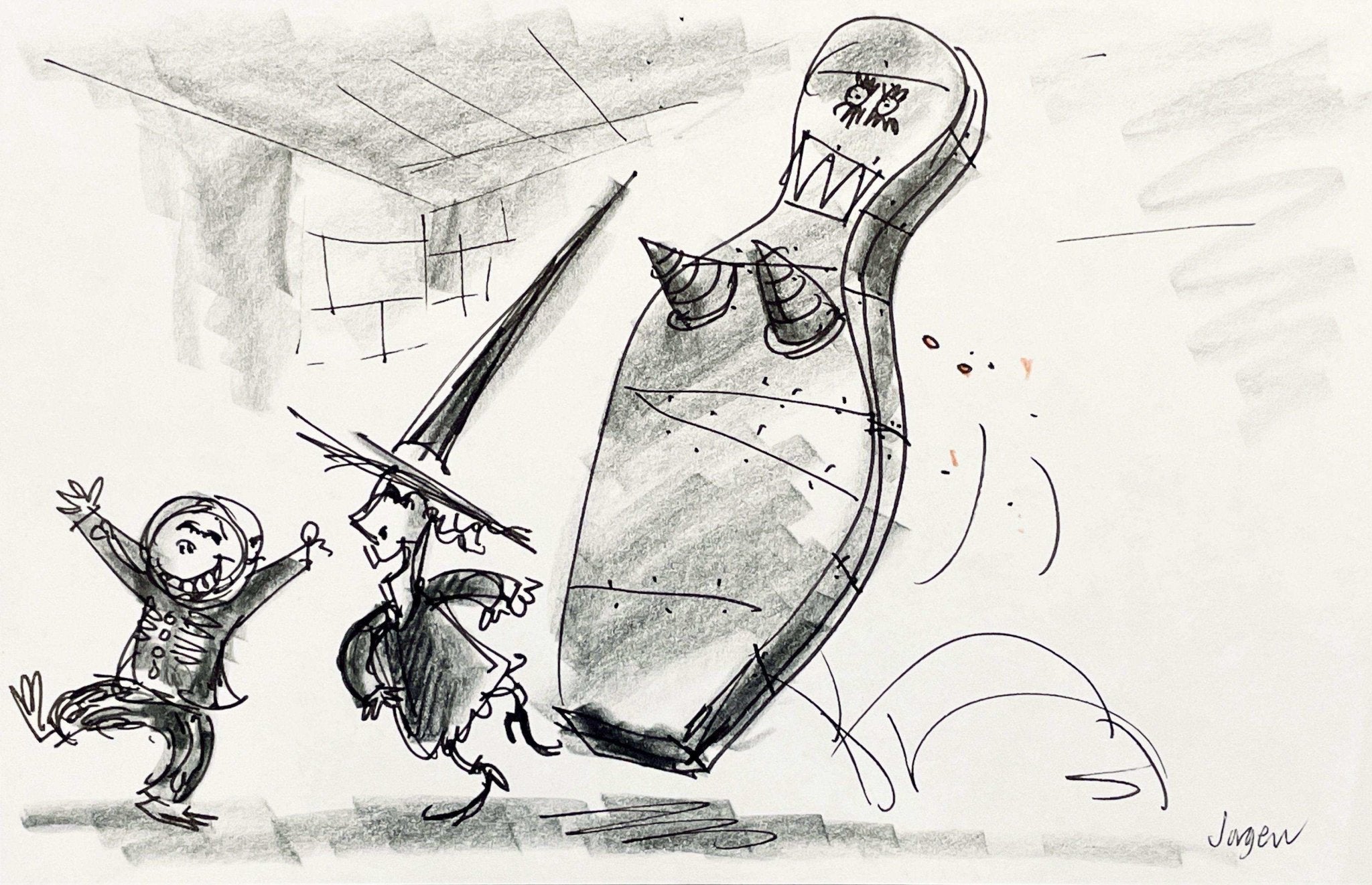 ABOUT THE ART AND ARTIST: Presented here is a wonderful original storyboard from Disney storyman Jorgen Klubien. Klubien is an animation artist and writer best known for his work on Disney films, like The Lion King (1994), A Bug's Life (1998), Cars (2006), and Frankenweenie (2012). The boards were rendered with pen, graphite, and marker on 8.5" x 5.5" paper. This piece is signed by the artist, Jorgen Klubien in the bottom right.