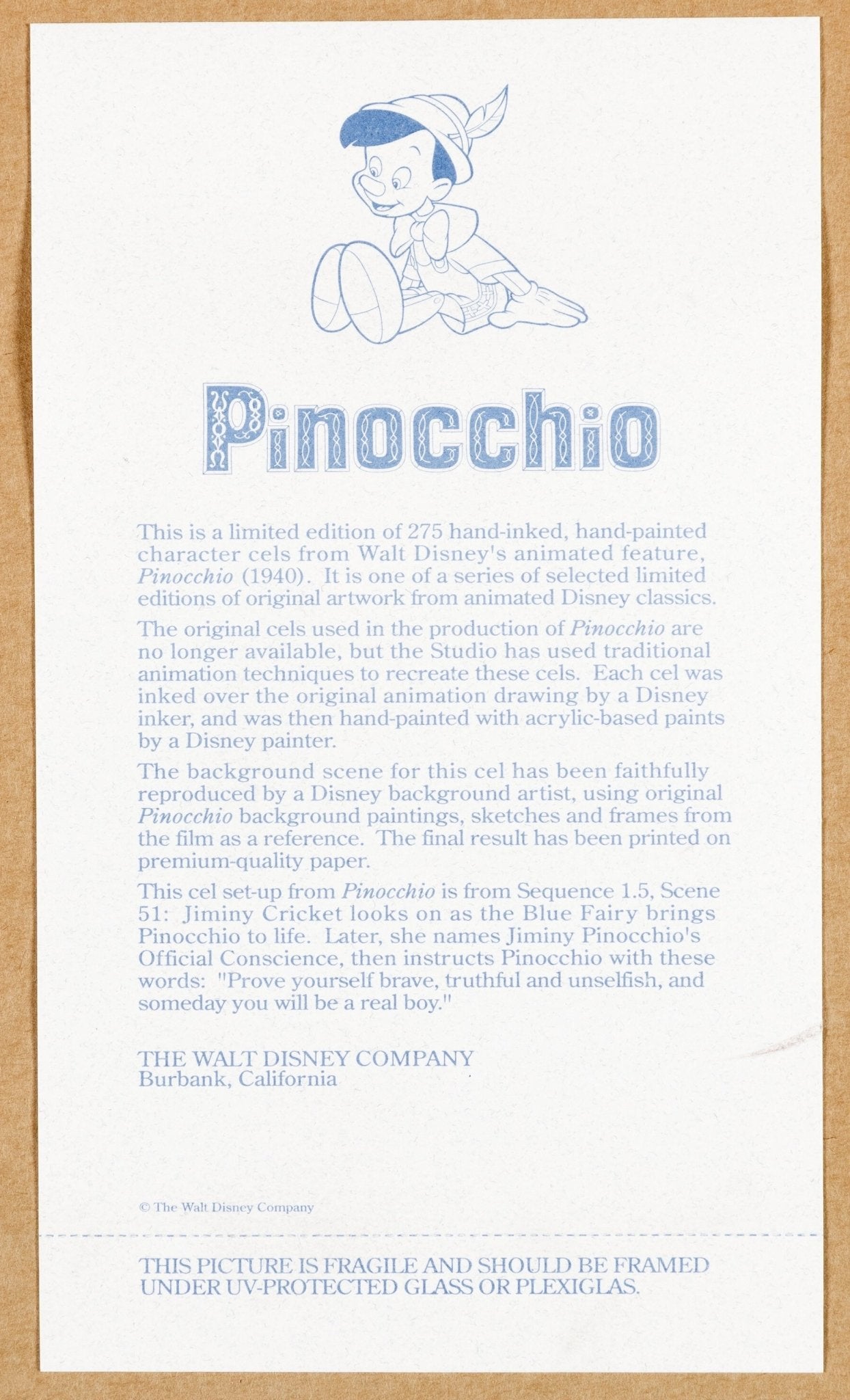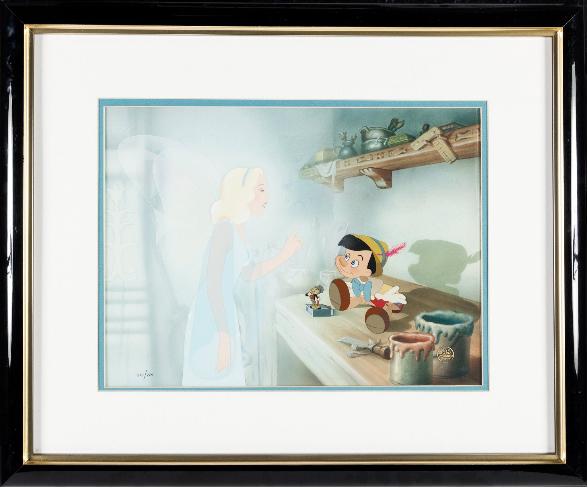 ABOUT THE IMAGE: Long sold out for over 30 years, presented is an incredible hand-inked and hand-painted limited edition cel inspired by the timeless animated masterpiece Pinocchio. Created at the Walt Disney Ink-and-Paint department, this cel features the Blue Fairy, Pinocchio, and Jiminy Cricket in a picture-perfect image from the unforgettable early scenes of the film. This moment can be seen at the 18:32 timestamp. The cel is kept in a Plexiglas-fronted frame sized 24.5" x 21" with a mat window of 15.5" x 11.5". Bearing a Walt Disney seal, the cel is numbered 212 of only 275 made. This piece comes with its original certificate of authenticity.